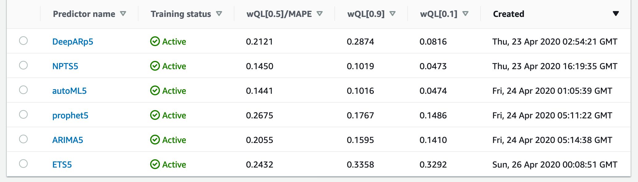 하나의 데이터-셋을 가지고 Amazon Forecast가 제공하는 모든 알고리즘들을 사용하여 예측기를 생성했습니다. 그 중 autoML도 있습니다. 그리고 개발자 공식 문서에 설명을 떠맡긴 숫자들이 세 개의 행(column)을 이루며 줄을 지어 있습니다. 이들의 숫자들은 낮을수록 예측의 정확도가 높다고 단순히 해석해도 오류는 없습니다. 그리고 autoML은 가장 적합한 알고리즘을 선택합니다. 이 두 조건을 && 로 엮으면, - autoML을 제외하고 - 이 데이터-셋으로 예측기가 가장 잘 훈련된 알고리즘은 'NPTS5'라는 이름을 가진 것입니다.